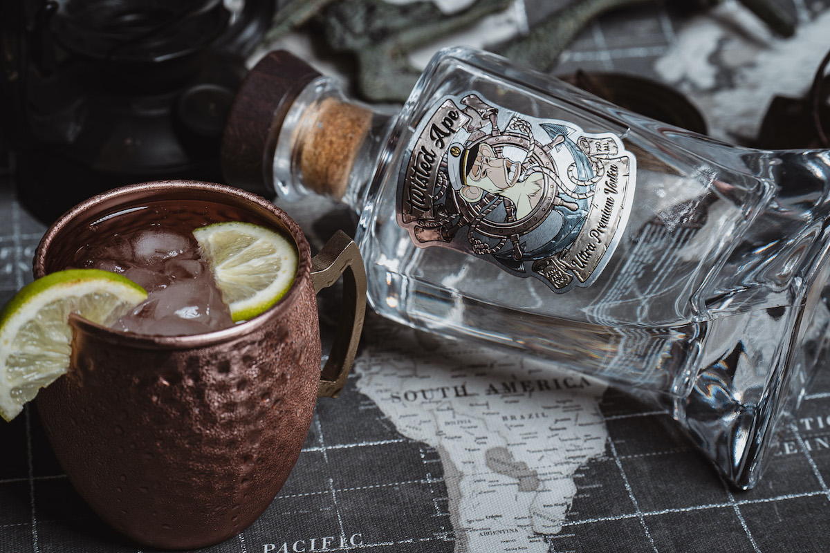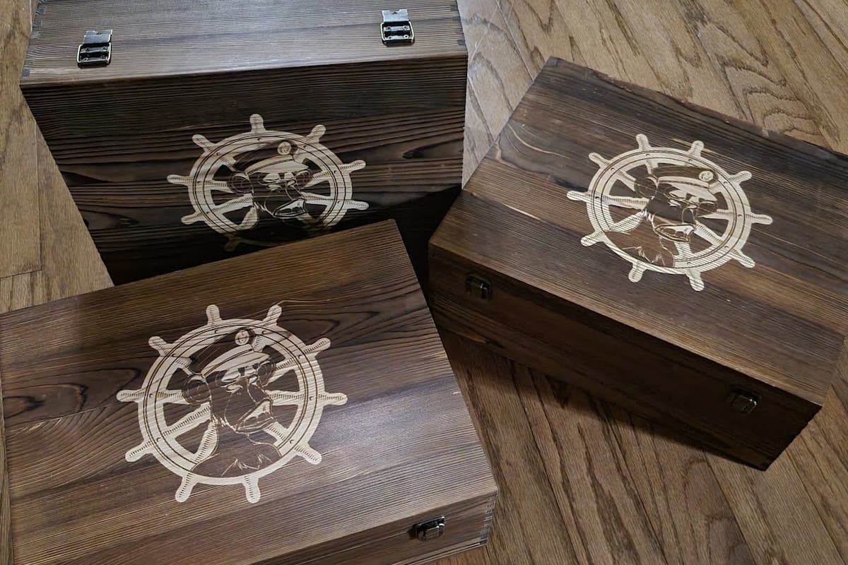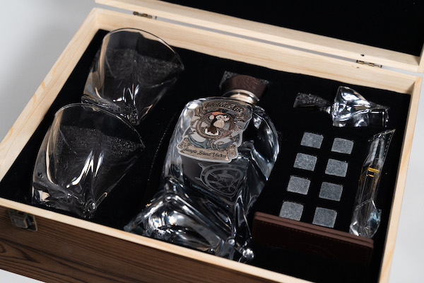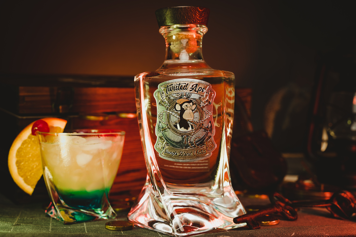 The Twisted Ape Treasure Chest is an exclusive limited edition collectors item and a perfect addition to your home bar, or an unmatched holiday gift for someone with impeccable taste. The custom designed wooden chest comes packed with a twisted glass decanter, a twisted glass stopper, a set of matching twisted glasses and a pair of brown leather coasters.